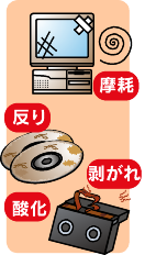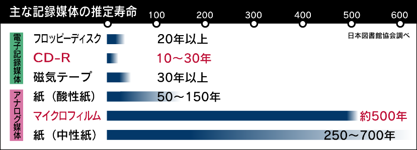 「CD-ROM」は表面を覆っているポリカーボネート樹脂は年数がたつと劣化し樹脂に包まれている電子データを記録したアルミ製円盤が外気に触れて腐食するため情報の読みとりが不能になります。
