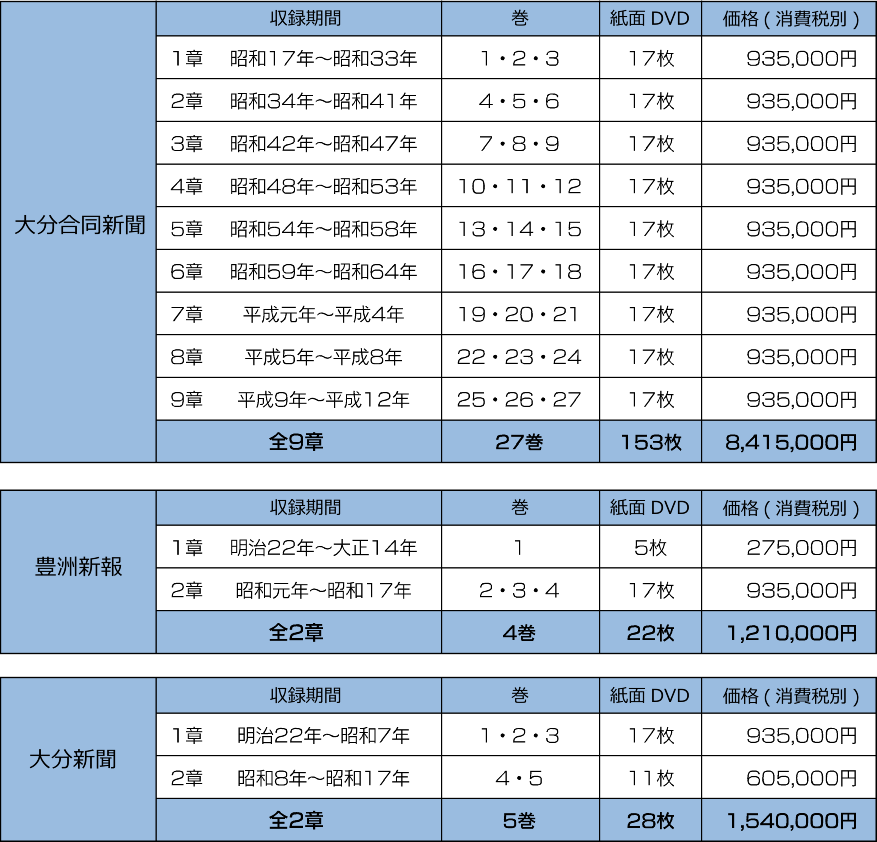 ●大分合同新聞DVD版は、明治22(1889)年2月から平成12(2000)年12月まで「大分合同新聞」「豊州新報」「大分新聞」の3新聞の紙面を収録しております。電子縮刷版です。