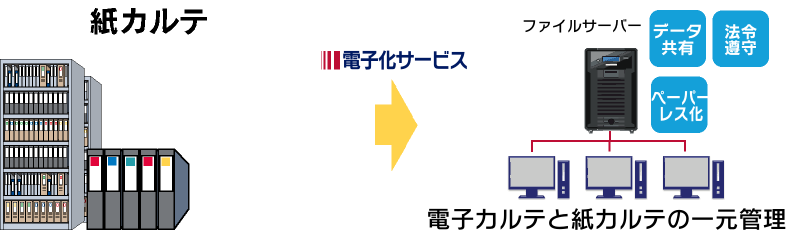 紙カルテ電子化サービスは、紙カルテをスキャナーにて電子化・デジタル化・PDF化業務を代行するサービスです。