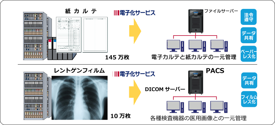 富士マイクロ電子化サービスにて、死亡/入院/外来(アクティブ)各カルテ140万枚を電子化。レントゲン10万枚の電子化。PACSサーバにて運用。